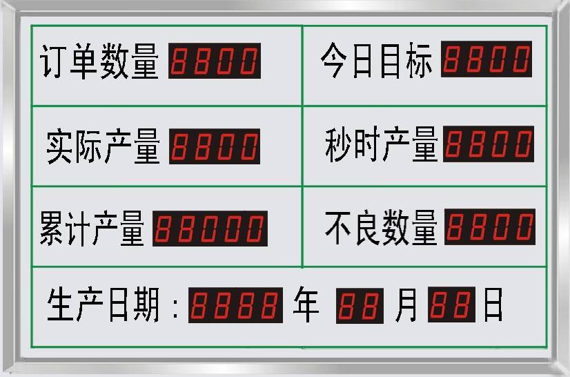 LED数字管理显示屏(电子看板)是专门为生产型企业设计的生产流水线数字显示屏,用于标示当天或当班的计划生产量、实际生产量、差异值、不良品、达成率、不良率等参数。其中计划生产量等可以由计算控制输入、键盘输入或遥控输入,实际生产量,不良品等通过检测安装在生产线上的红外感应开关、行程开关等自动录入或通过按键录入,差异值、达成率、不良率等由看板内部的单片机计算并显示出来。LED数字管理看板的应用将有利于提高企业管理水平、降低企业的劳动力成本、激发员工的生产积极性等从而使企业获得更大的利润空间。
