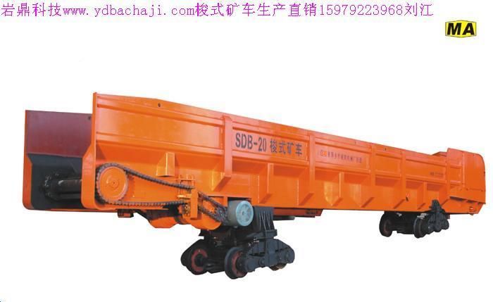 梭式矿车[轨轮式梭式矿车Shuttlecar]用于隧道、井巷、矿山开采、引水洞、导流洞、石油输送管道、天然气输送管道、隧洞掘进和采矿施工中的一种出碴、转载、贮存、运输设备,属于井下运输转载设备。主要由槽形车厢、刮板链条和走行部分组成,须用牵引机车牵引在轨道上行驶。车体设置在两个转向架上,在车厢底板上装有刮板或链板运输机,用风或电力驱动,也有风电两用的,普遍采用电动驱动工作。