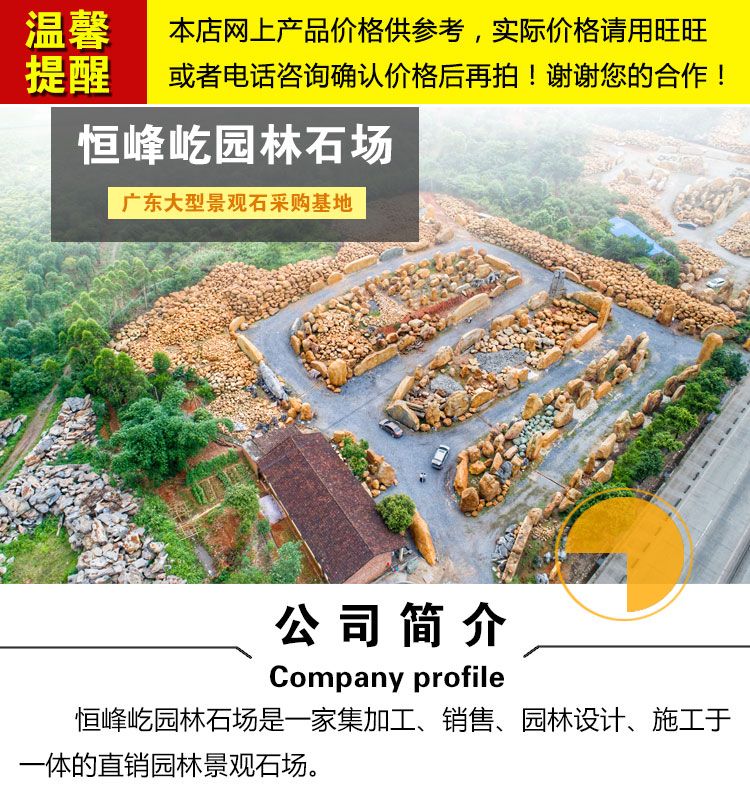 韶关市恒峰屹园林石场是一家“专业、诚信、先行、创新”的大型园林景观石场。公司位于韶关市浈江区韶关大学路段,主要生产销售大型景观石,大型黄蜡石,大型刻字石,大型太湖石,吨位黄蜡石,驳岸石,园林草地石,鹅卵石,晚霞石,英石(英德石),千层石、假山石、草地石、园林点缀等园林景观石。承接园林施工,包括:市政园林绿化工程、小区街景、观景假山、风景景观石、大小花园鱼池假山制作,亭台搂阁、木屋等工程设计施工等 。我们坚持诚守信誉、严控品质、服务周到,打造社会各界提供优质的产品和优质的服务。公司凭借多年来专业的技术,在石源、加工、物流、技术各环节下功夫,形成专业团队,不断创新的精神使公司发展迅速。我们凭借着自身丰富的矿产资源,先进的开采、加工设备,专业的高素质人才,精湛的施工人员以及诚信的经营,现已发展成为一家集矿产开发,运输、设计、加工、销售、工程施工及安装于一体的大型石场。