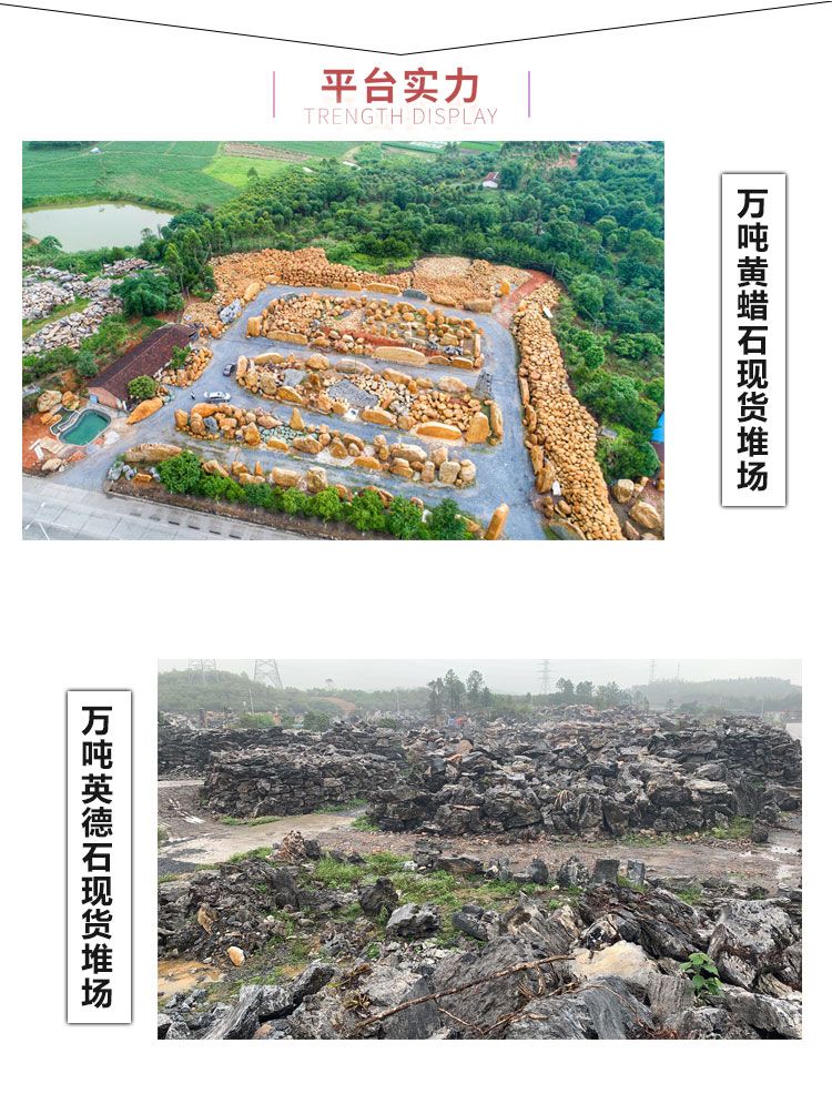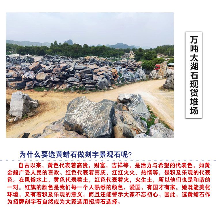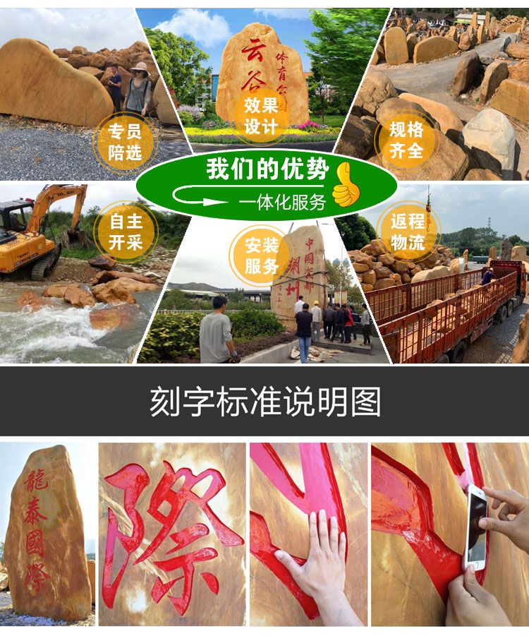 本公司主要批发大型黄蜡石,太湖石,黄蜡石,英石,台面石,刻字石等园林景观石,并承接以景观石为主题的各种园林工程。我们拥有专业的团队,经验丰富的技术人员,按顾客需求打造出各种不同的景观环境,园林假山,顾客的满意是我们不懈的追求。公司在长期的实践中培养了一批拥有丰富经验、技术高超的景观石制作人员,可以为广大客户提供强劲的技术支持。开采,加工,安装等一体化服务,景观石产品远销全国各地及海外且都获得客户的认可。公司以重合同、讲信誉为经营理念,保证质量、及时供货,按期完工为宗旨,竭诚欢迎新老客户光临洽谈,我们将为您提供优质服务。