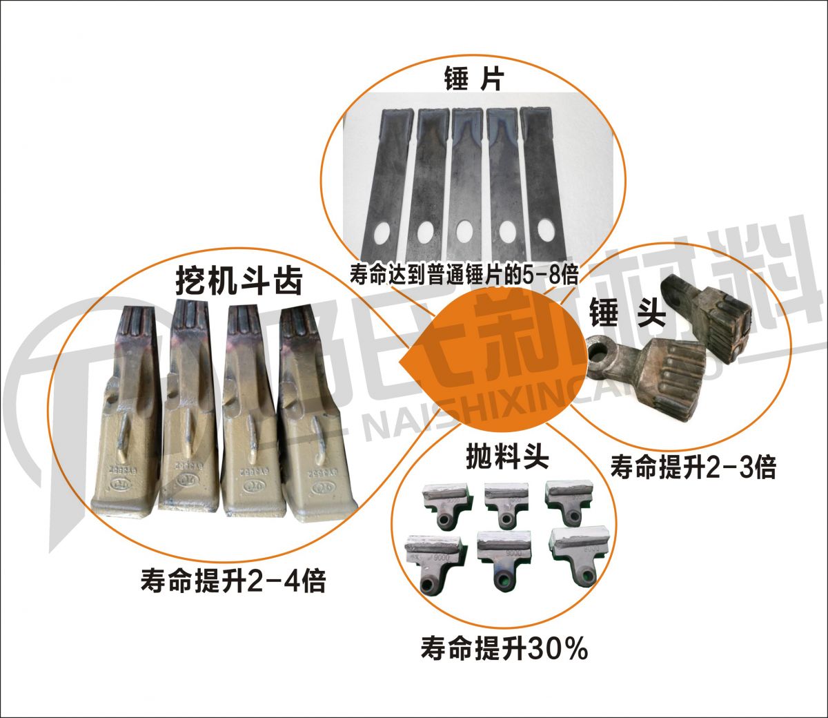 公司主营产品有:高硬合金粉末系列,粉碎机锤片(三高合金耐磨锤片),耐磨斗齿,制砂机抛料头,矿山锤头等易损件。产品优势:采用高硬度、高耐磨、高耐冲击的合金粉末,自主**的高能熔覆自动化生产工艺,保证了产品的质量稳定。