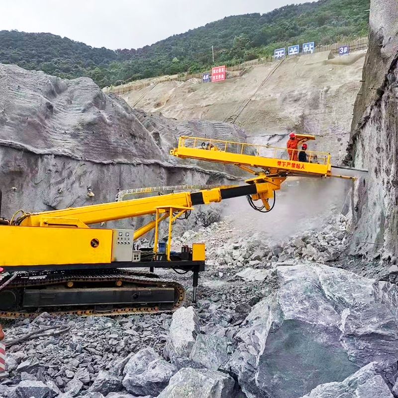 老式边坡支护锚杆钻孔方式。大多需要搭建脚手架施工难度较大、成本较大、安全风险较大,效率低下:所用设备多为简易电动锚杆机,在高空中移动及不方便。这种施工方式耗费人力、物力极大,大大增加了施工成本,工期较长,安全风险较大。