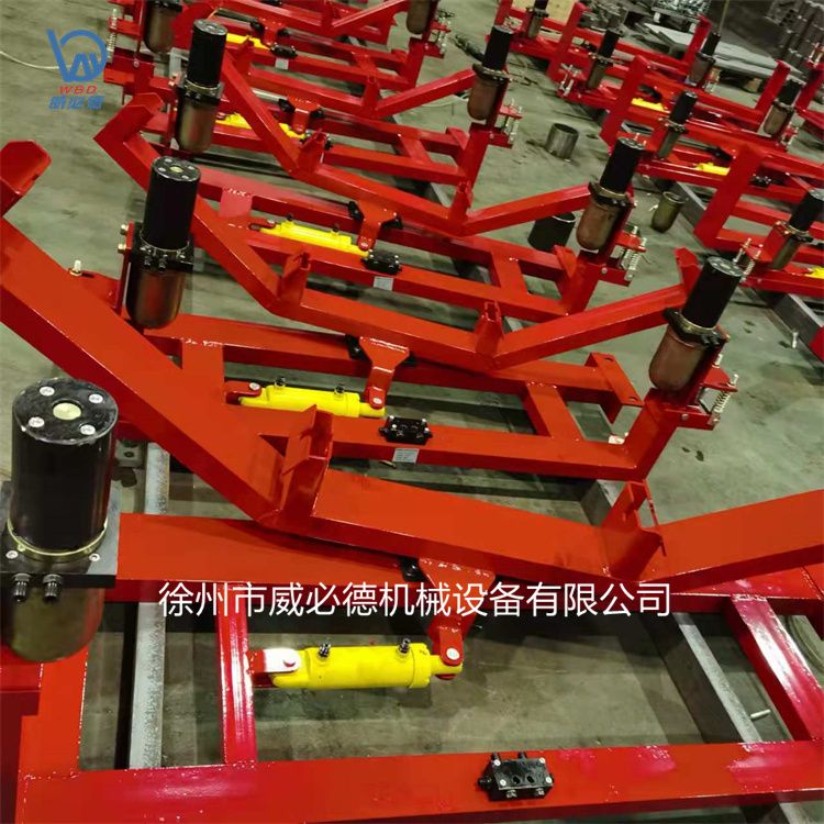矿用液压皮带纠偏防跑偏器由上、下调偏架、传动装置、底座等部分组成,采用立辊带动拐臂,拐臂推动连杆,连杆推动调偏架的结构。根据跑偏状况利用托辊的切向力,控制调偏架的转动角度,从而自动进行胶带的调整。调配连续,阻力小,力矩大,调偏架可调角度40°。