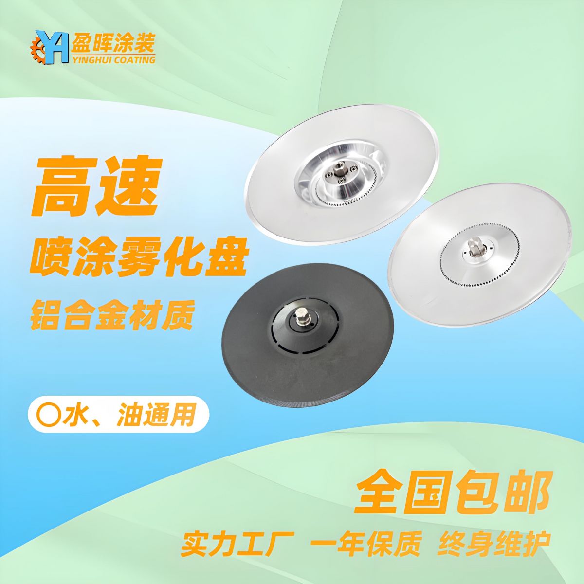 盈晖旋碟雾化盘材质为硬度铝合金,表面处理光亮耐腐蚀,适合水性油漆使用。转速可达到30000r/min。