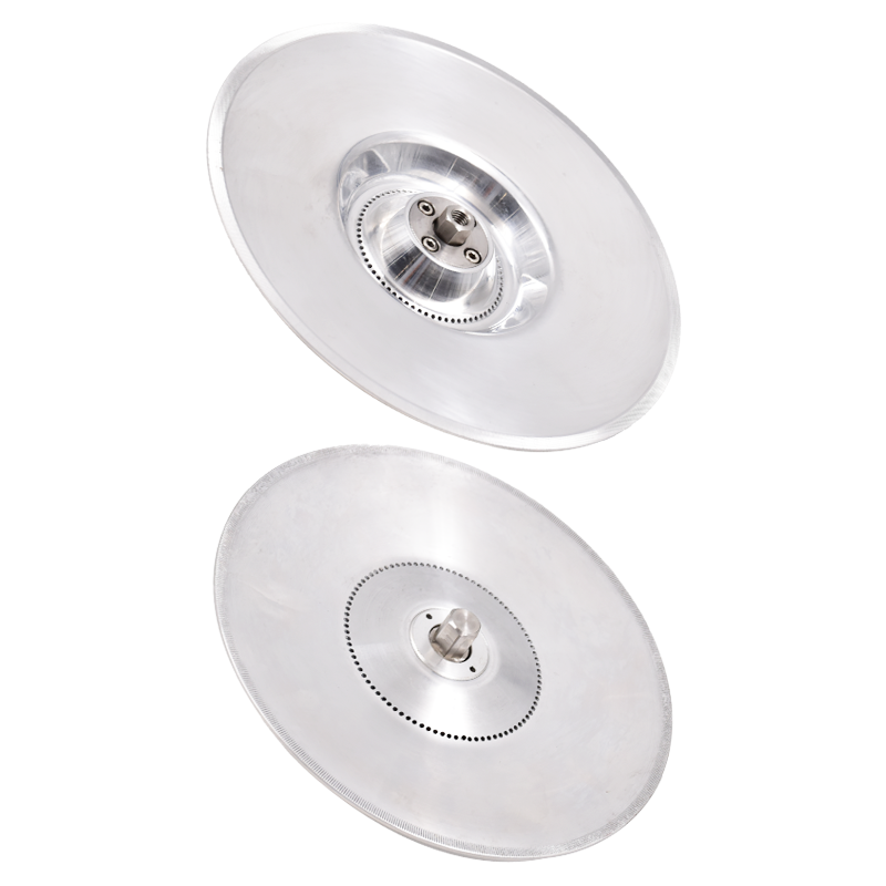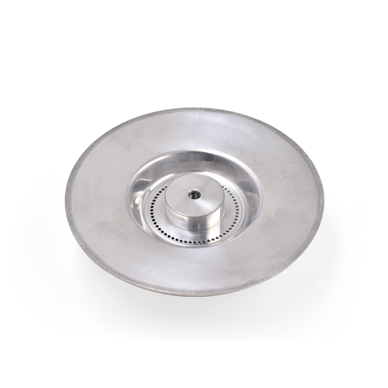 旋碟静电雾化盘是静电自动喷漆机器主要部件,承担涂料雾化功能,涂层均匀及雾化颗粒大小省油有直接关连。静电雾化盘安装在气动马达转轴上,涂料由供漆系统输送到喷漆盘内壁再经过高速离心旋转往盘的底部小孔甩出碰撞形成雾状微小颗;雾状涂料带有负极静电迅速吸附到带正极工件(接地正极);完成静电喷漆涂层作业。